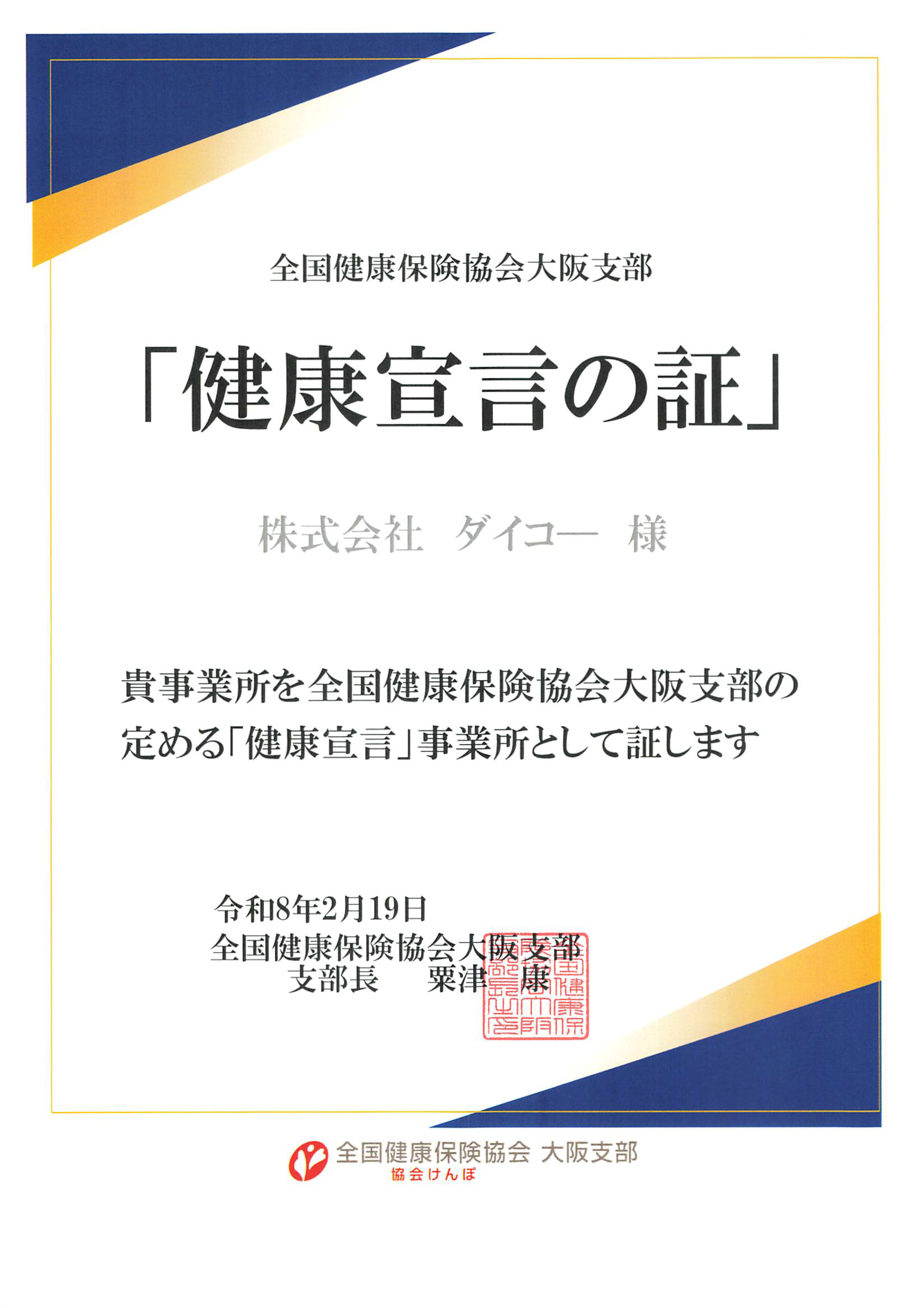 令和8年2月19日付で、同支部より「健康宣言の証」を交付されましたことをお知らせいたします。
