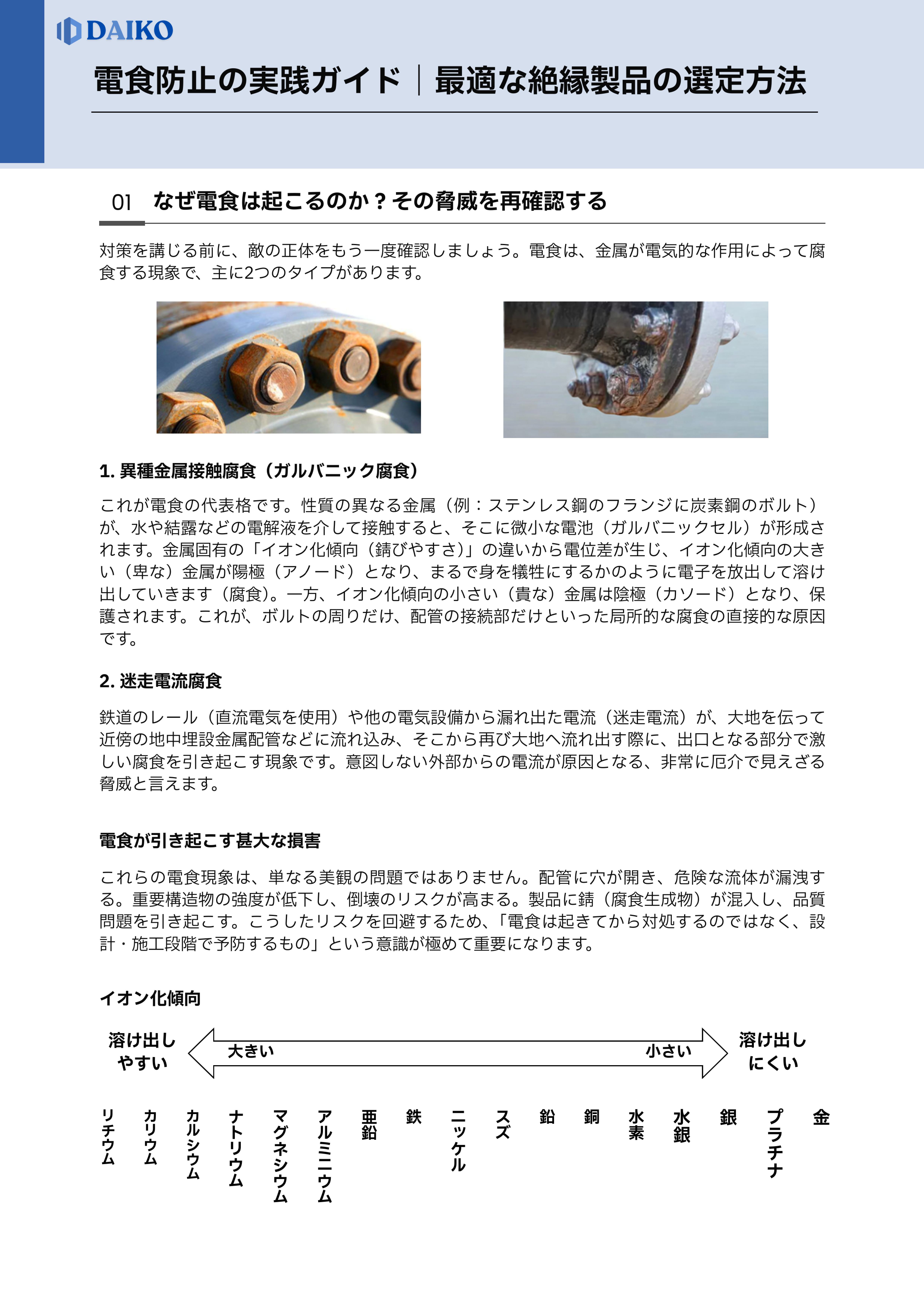 配管やフランジ接続部で発生する電食(ガルバニック腐食)は、漏洩や設備損傷の重大原因です。本資料『電食防止の実践ガイド』では、異種金属接触腐食の仕組みと、防止に効果的な絶縁ガスケット・スリーブ・ワッシャーの選定方法を解説。