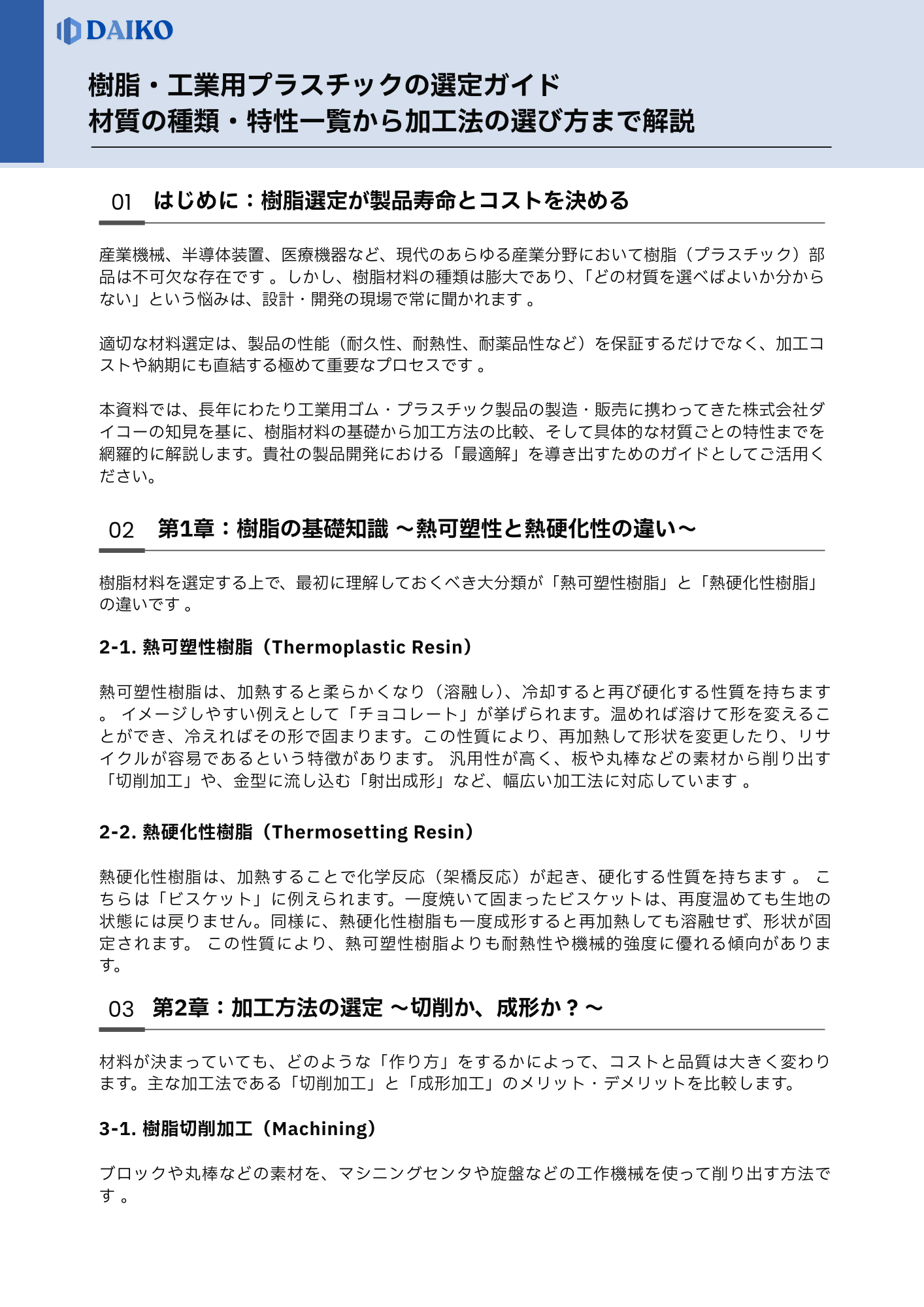 樹脂(プラスチック)の種類と特徴を徹底解説。汎用プラ・エンプラ・スーパーエンプラの違いや、熱可塑性・熱硬化性の分類を網羅。PP・PC・PEEKなどの用途・コスト比較表付き。選定・樹脂加工はダイコーへ。