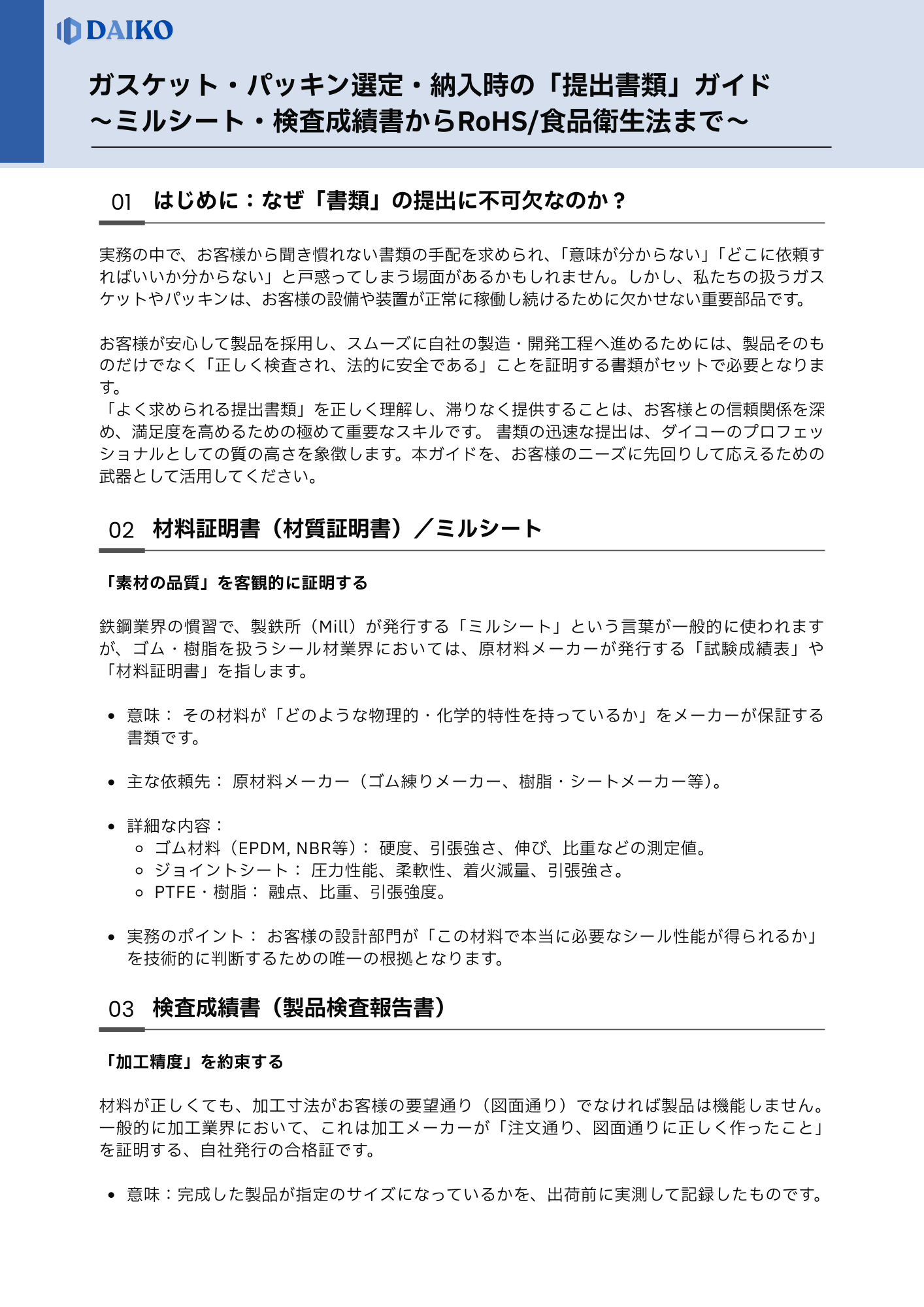 材料証明書(ミルシート)やSDS、RoHS、該非判定書など、ガスケット・パッキン手配に必要な「提出書類」を完全解説。購買・新人担当者向けの実務ガイドを無料ダウンロード。書類の手配から製品加工まで、ダイコーにお任せください。
