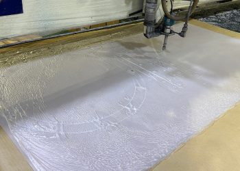 ウォータージェットによる精密なカットと、熟練の技術による接着加工を組み合わせることで、大型で複雑な形状の製品製作にも対応します。
