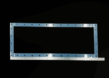 お客様の図面に基づき、厚さ3mmのシリコンゴムシートから、463mm × 1198mmの大型額縁形状ガスケットを1枚製作しました。まずウォータージェット加工機で4つのパーツを精密にカットし、その後、シリコンゴム専用の接着剤を用いて4隅を接着加工し、一体のフレーム形状に仕上げました。加工内容には、φ34mmの穴を13ヶ所あける作業も含まれています。