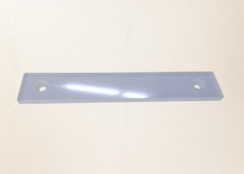 お客様の図面に基づき、食品衛生法適合のシリコンゴム(厚さ5mm)から、25mm × 150mmのプレートを4個製作しました。加工内容は、φ5.5mmの穴を2ヶ所あけ、さらにその穴に皿穴加工(ザグリ)を施すというものです。当社のプロッター加工機(ルーター機能付き)を使用し、刃物によるカットとルーターによる切削を組み合わせて、金型不要で製作いたしました。