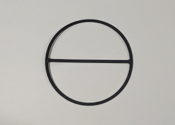 お客様の図面に基づき、厚さ1.5mmのジョイントシート「TOMBO No. 1991-NF」から、冷凍機コンプレッサー用のガスケットを4枚製作しました。形状は外径φ240mm × 内径φ224mmのリングの中に、9mm幅の枝が通る「センタ-枝付き」の形状です。当社のウォータージェット加工機を使用し、CADデータから直接、複雑な枝付き形状も高精度に切断しました。