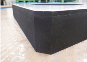 お客様の仕様に基づき、厚さ55mmのEPDMゴムブロックに、厚さ1mmのPTFE(テフロン)シートを貼り合わせ(積層)加工した特殊な素材から、310mm × 1466mmの大型製品を1枚製作しました。加工内容は、φ194mmの穴あけと、コーナー部分へのC15の面取り加工です。当社のウォータージェット加工機を使用し、硬さの異なる異種素材の貼り合わせ品も、接着面を剥離させることなく高精度に切断しました。