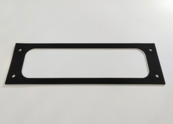 お客様の図面に基づき、厚さ3mmのネオプレンスポンジ(ネオスポ)から、148mm × 478mmのシール用パッキンを22枚製作しました。加工内容は、φ10mmのボルト穴を4ヶ所、および内径角部分にR30の曲線加工を4ヶ所施すものです。当社のウォータージェット加工機を使用し、柔らかいスポンジ素材を潰すことなく、CADデータ通りにシャープな切り口で精密にカットいたしました。