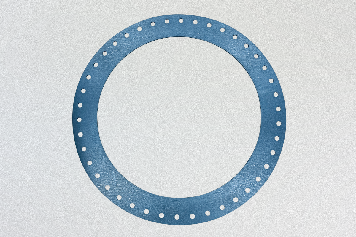 今回の事例は、プラント設備で使用される外径985φの大口径フランジ用ガスケットです。巨大なサイズでありながら、多数のボルト穴を配置した複雑な形状に対し、高い寸法公差と穴位置の再現性が求められました。材質には最高品質のTOMBO No.1120を選定し、ウォータージェット加工を採用。材料の性能を損なうことなく、正確な穴配置を実現し、現場での組付け作業性と確実なシール性の確保に貢献しました。