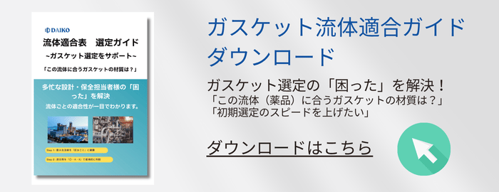 そんな多忙な設計・保全担当者様の「困った」を解決するため、ガスケットの専門家である株式会社ダイコーが、現場で本当に役立つ「流体適合表」を無料のホワイトペーパー(PDF資料)としてご用意しました。